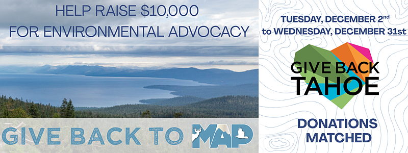 Help Mountain Area Preservation (MAP) raise $10,000 for Truckee Tahoe environmental advocacy and donate from December 2nd to December 31st during the Give Back Tahoe campaign to help fund MAP's mission and work! Donations will be doubled due to the generosity of longtime supporters who believe in MAP's priority campaigns to protect open space, preserve mountain character, and support the Truckee Tahoe community through grassroots environmental advocacy!