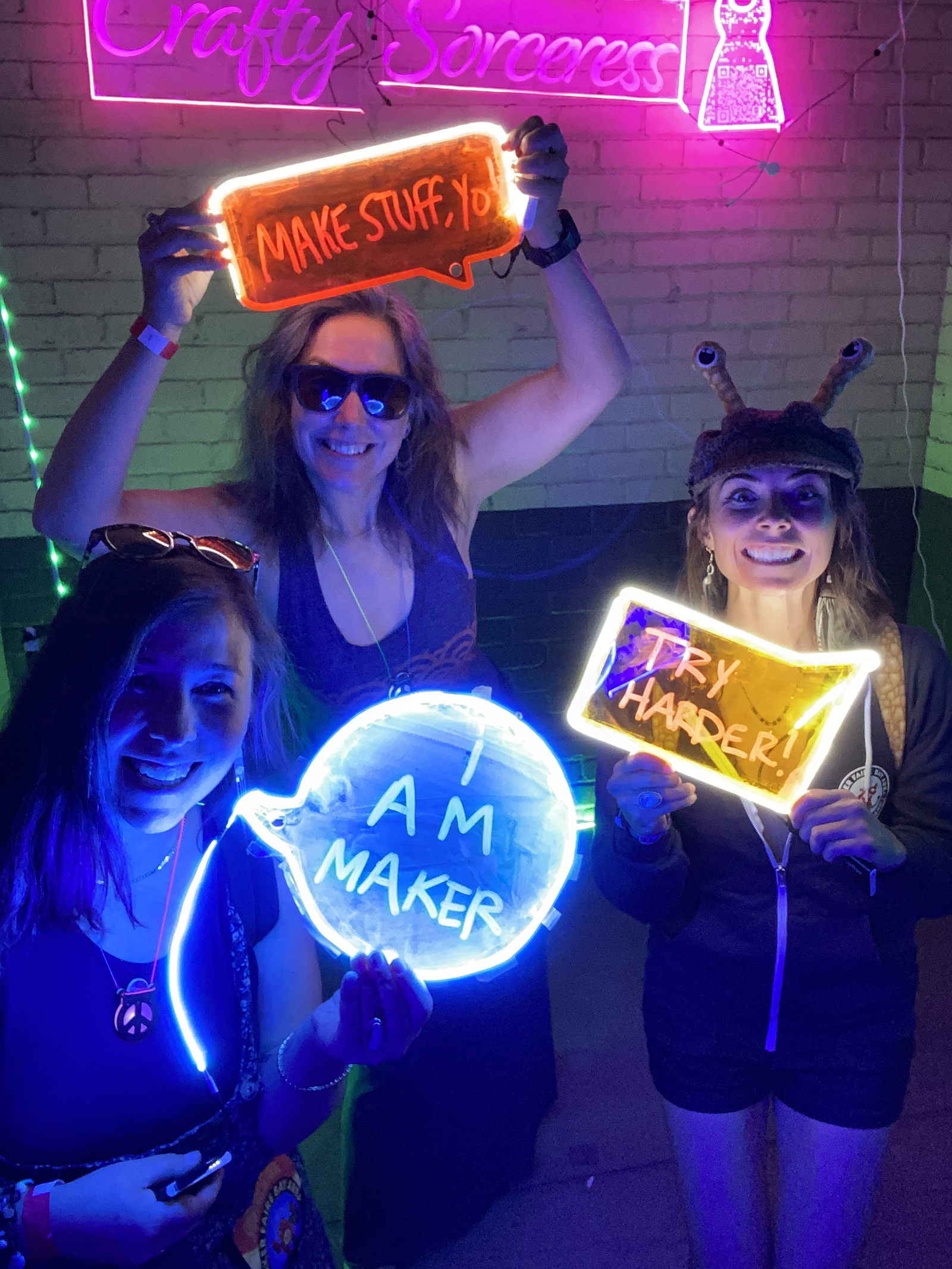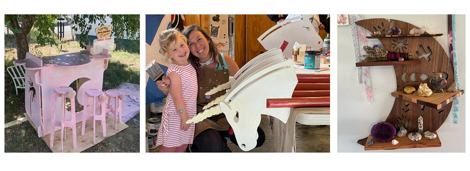 Also this year, I pushed myself to learn a tool I've avoided for too long... the CNC router. It’s big, it’s loud, it’s intimidating… but with the guidance of our incredible instructors (thank you, Grant and Brian!), and a few very rough cuts, I learned. I even designed and built a bar and stools for my Burning Man camp (love you, Bears!), unicorn toys for my niece’s 5th birthday with the help of my big bro (love you, bro!), and a moon shelf for my best friend’s new baby room (love you, Paigey!).